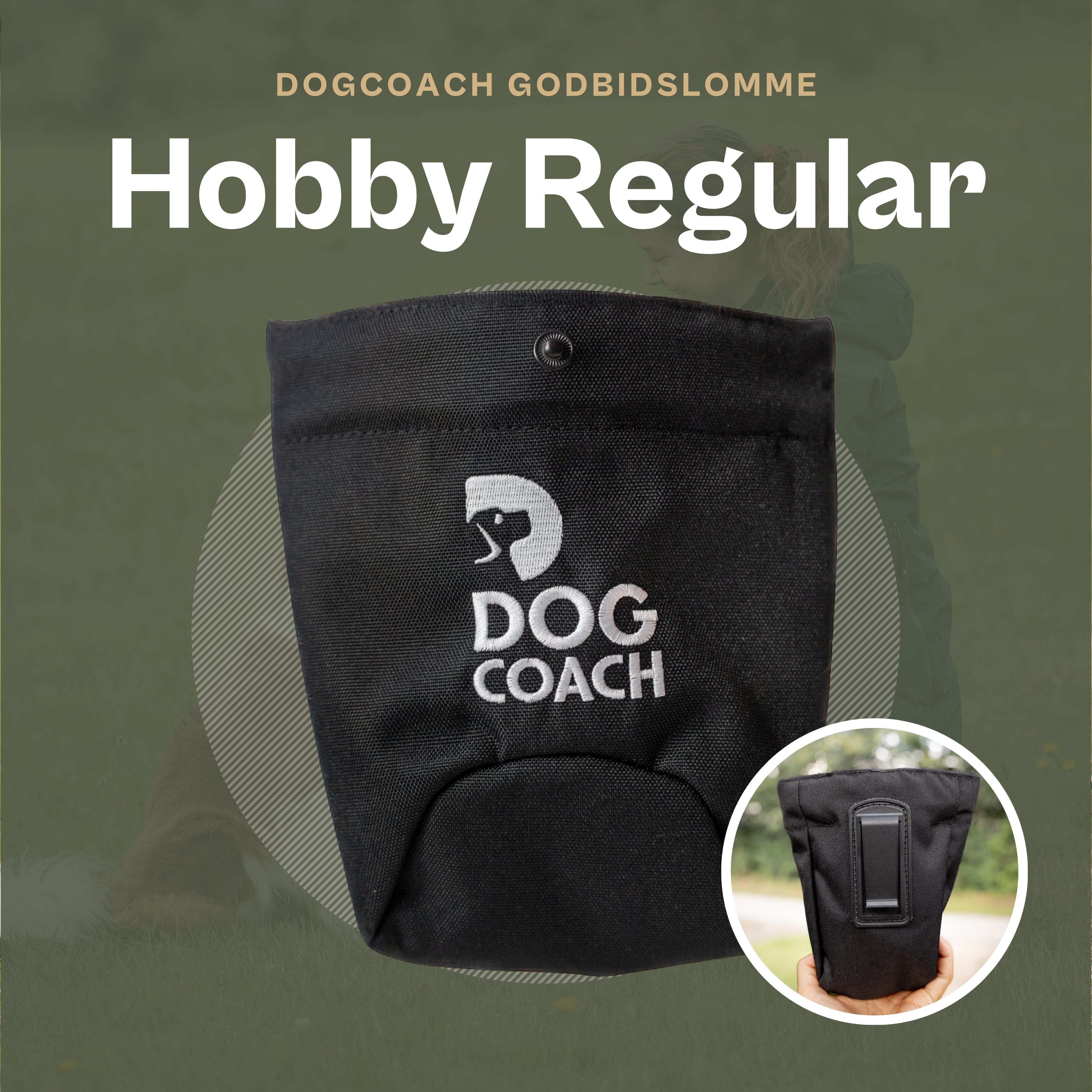 Regular passer direkte i lommerne på DogCoach-tøjet, men kan også fastgøres med clips i bælte eller buksekant. Mål: 18 cm i toppen, 12 cm i bunden x 18 cm lang