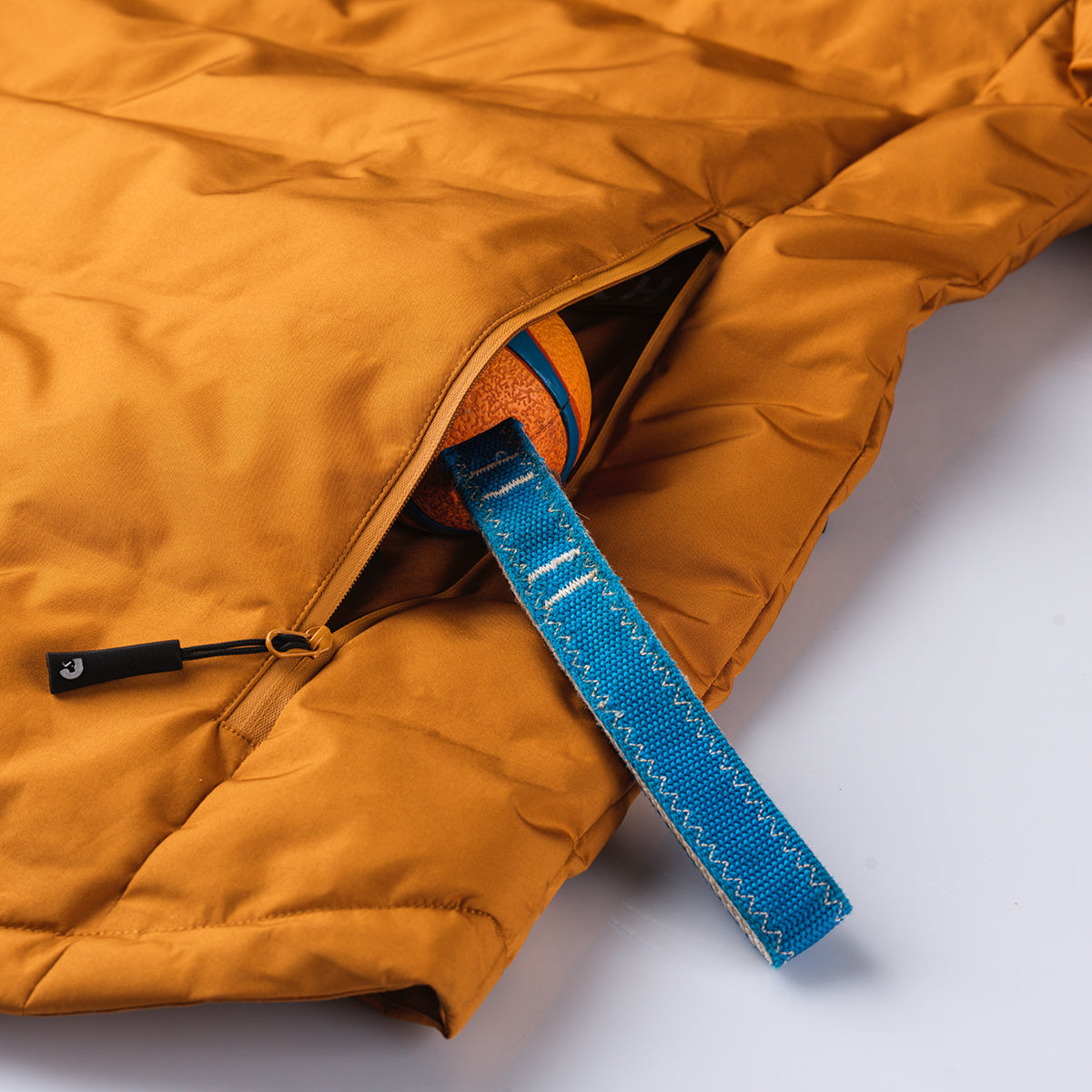 Elastisk strop, der gør det muligt at bære jakken over skulderen eller hoften, når den er pakket sammen – eller bruge den som et bælte, hvis du ønsker at fremhæve taljen