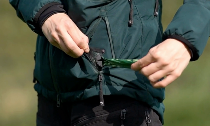 6 lynlåslommer foran – god plads til både godbidder og hænder. Diskrete knapper i sidelommerne til fastgørelse af godbidslomme